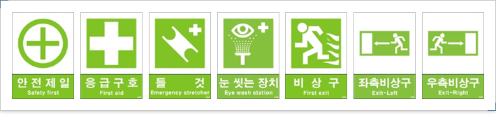 바탕:녹색, 관련 부호및 그림 : 흰색 // 안전제일 바탕:흰색, 기본모형 및 관련부호: 녹색